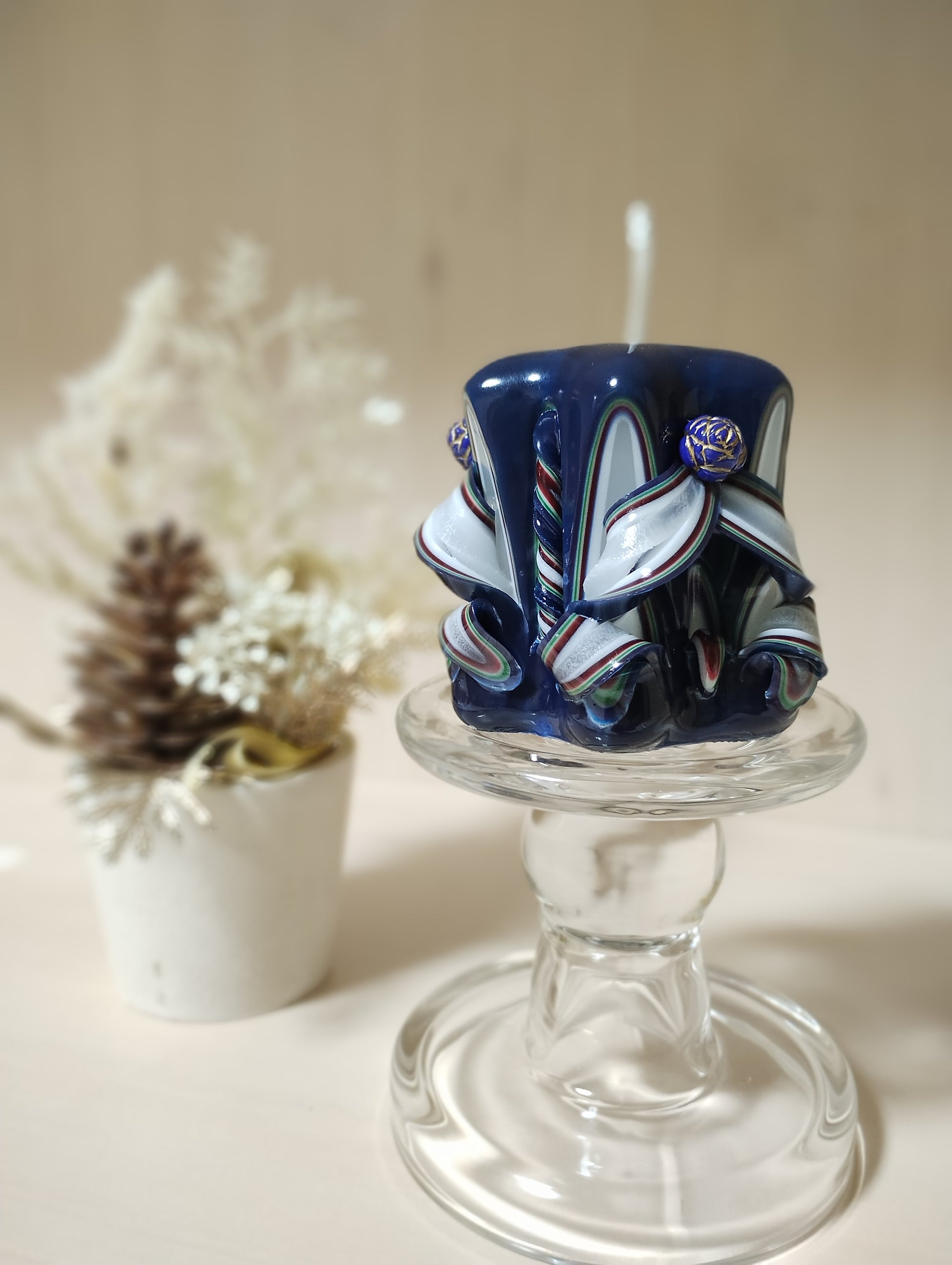 内側の白が落ち着いた青色の美しさを引き立てるキャンドルです。